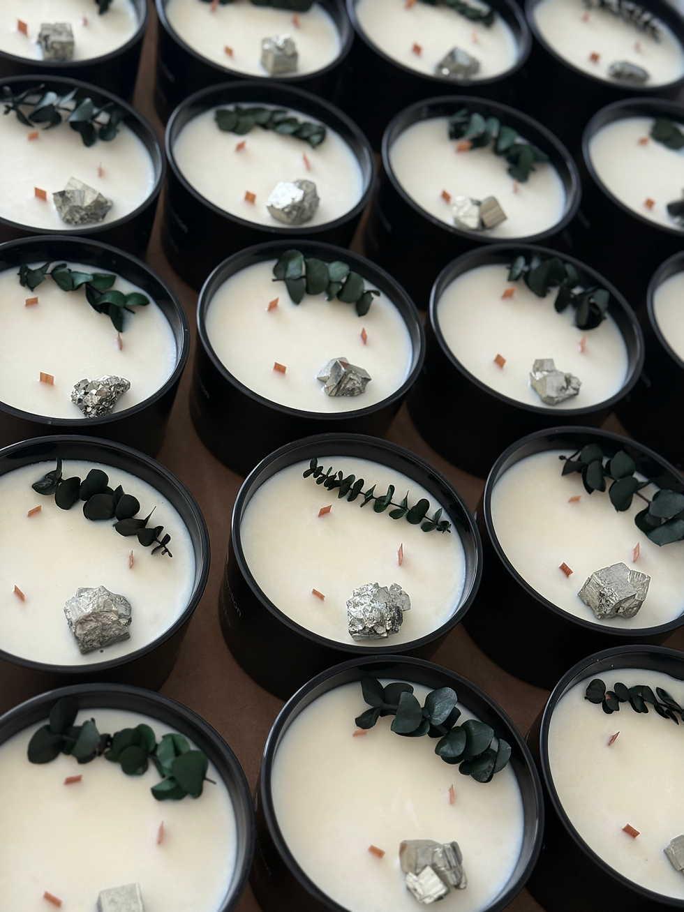 To complete the design, each candle was infused with a cubic pyrite crystal - a symbol of prosperity and protection - and a dried eucalyptus branch.