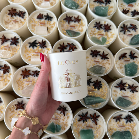 To bring a touch of festive magic to the collection, the candles were delicately decorated with gold flakes, star anise, and a curated selection of healing crystals including amethyst, clear quartz, green aventurine, and citrine. Each element was chosen for both its visual harmony and energetic symbolism, representing balance, clarity, prosperity, and joy.